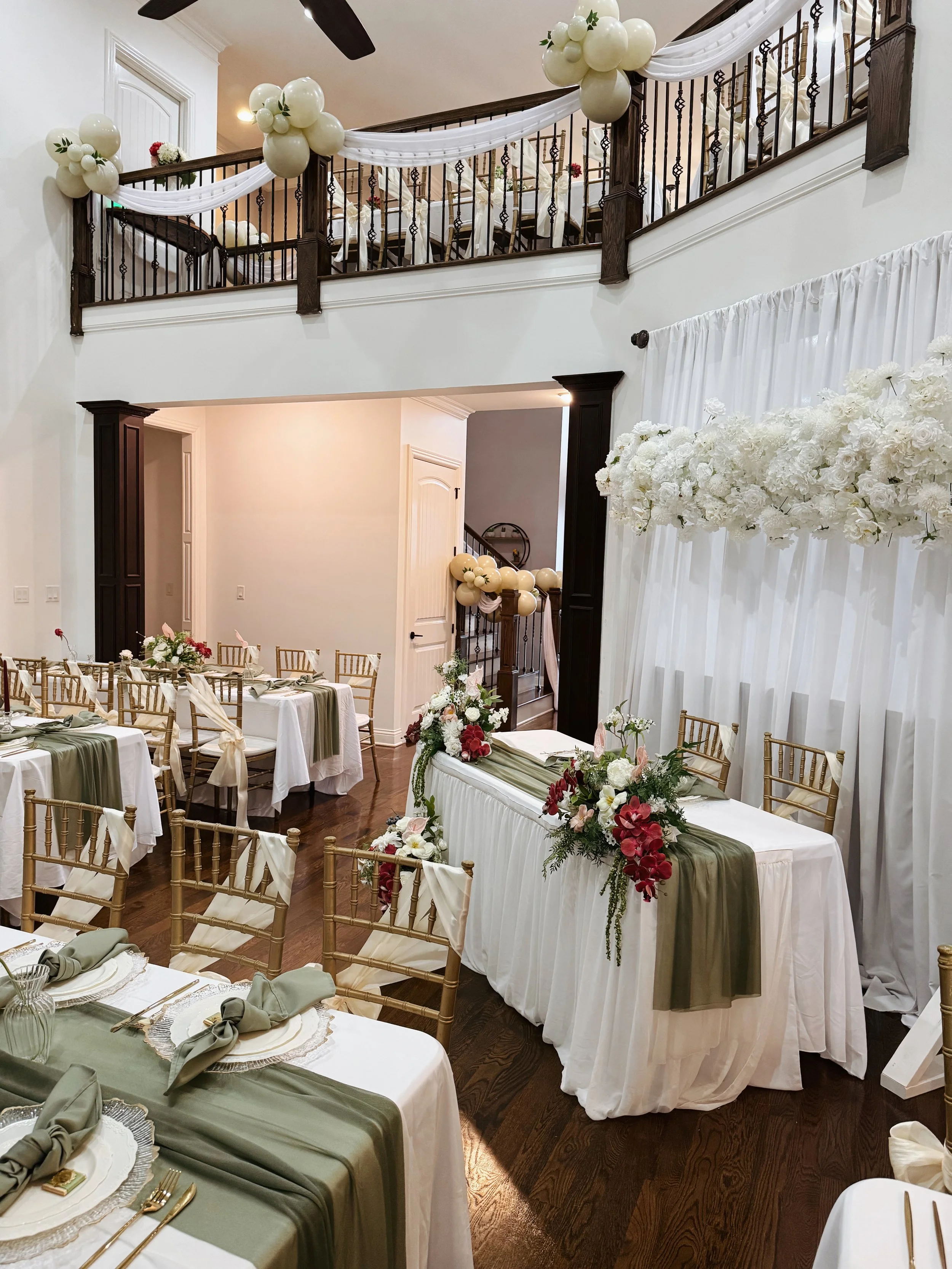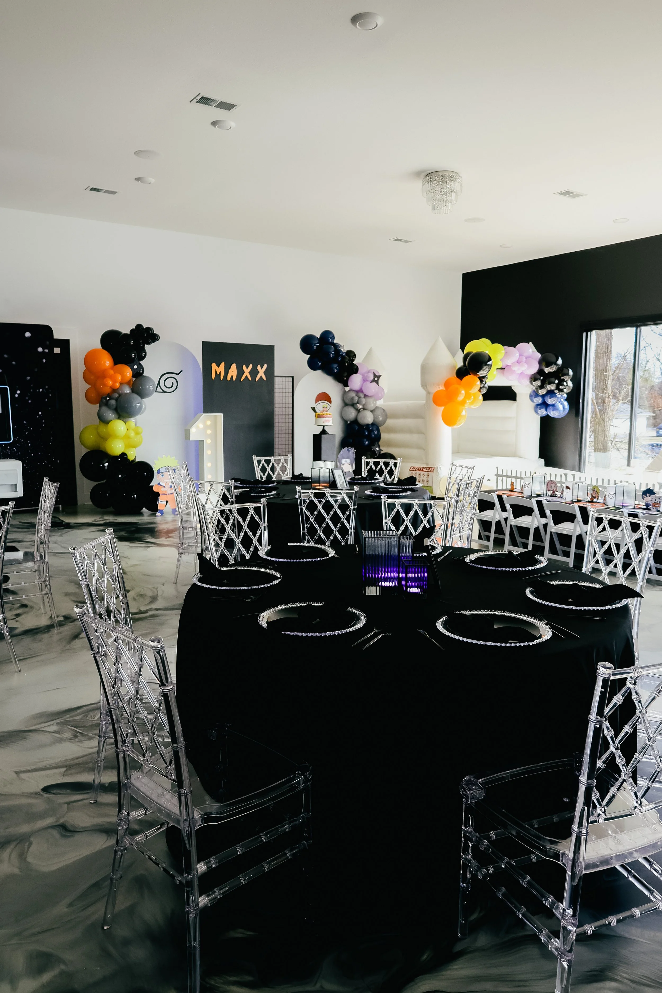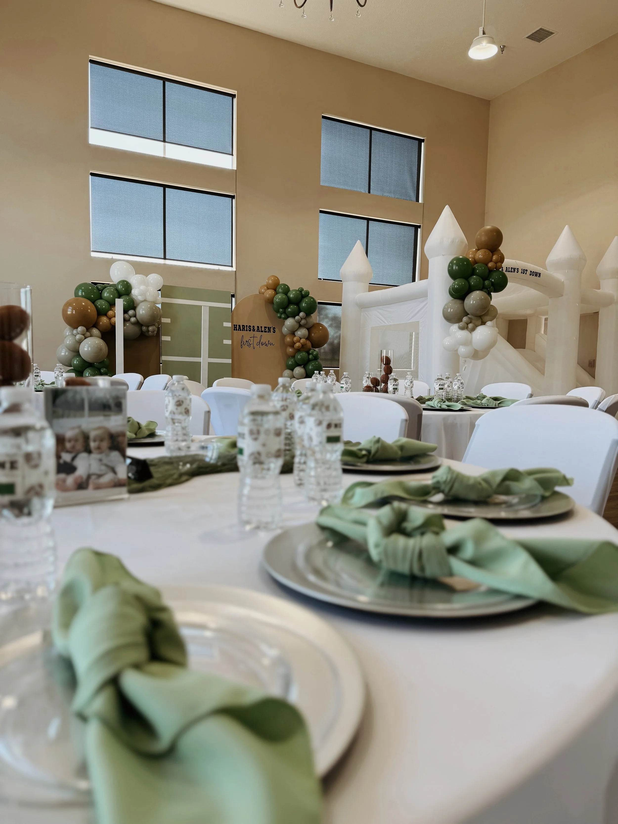 This package is perfect for birthdays, baby showers, bridal showers, intimate weddings, and private dinners with up to 30 guests. It includes setup and pickup (please note that pickup does not include full breakdown), tablecloths, four centerpieces, napkin rentals, charger plate rentals, one standard backdrop with an 8-foot basic balloon garland, and a welcome sign with easel rental.