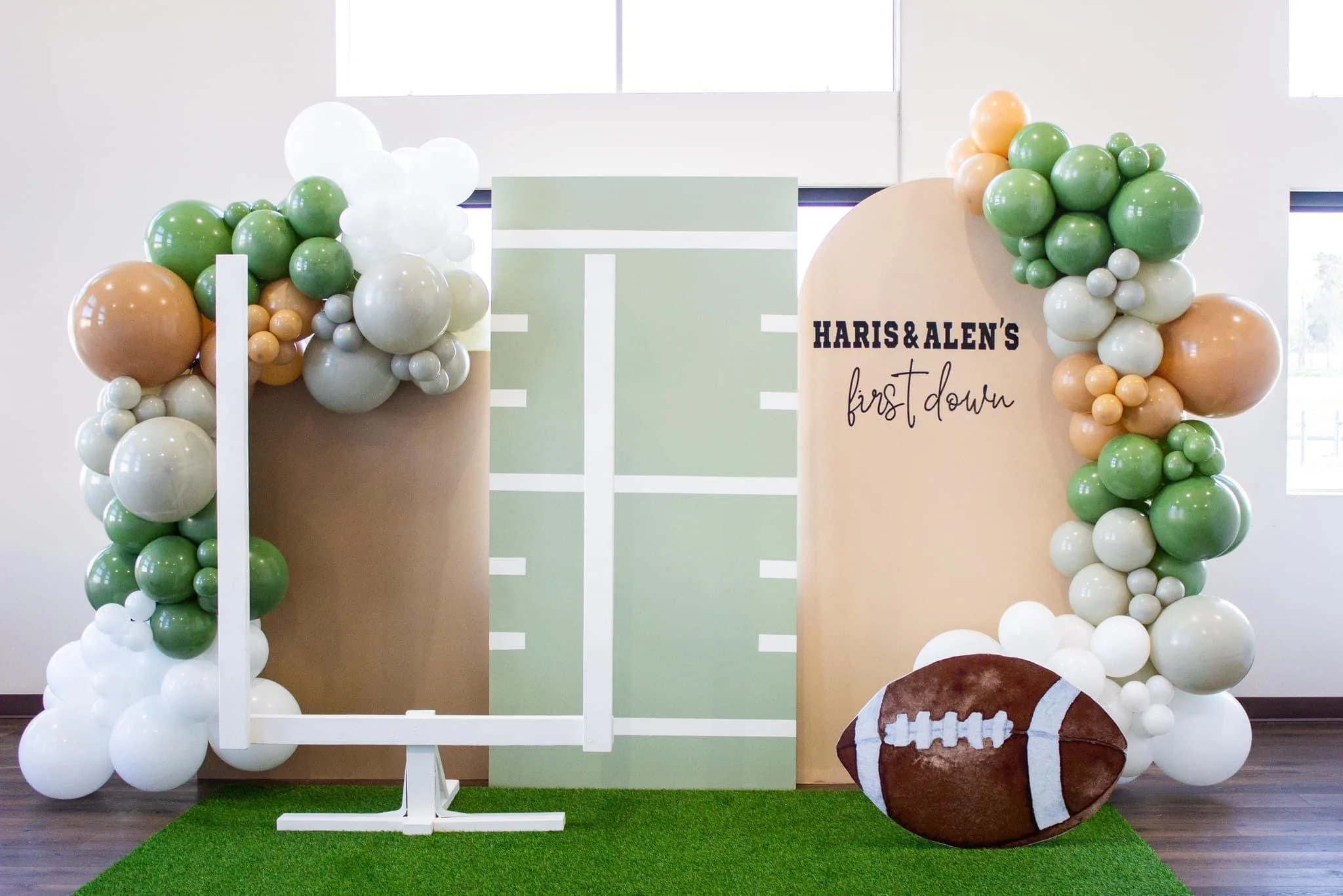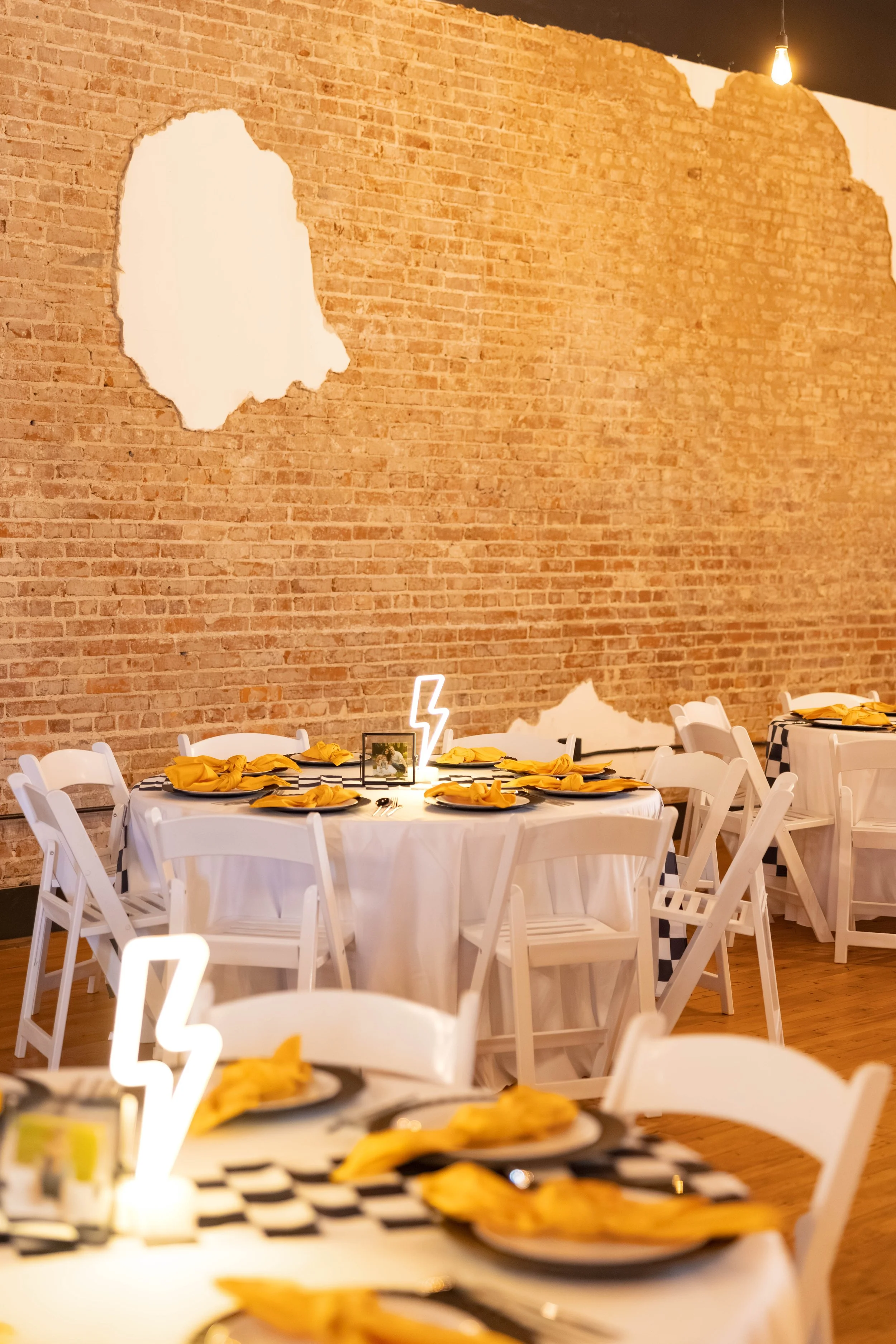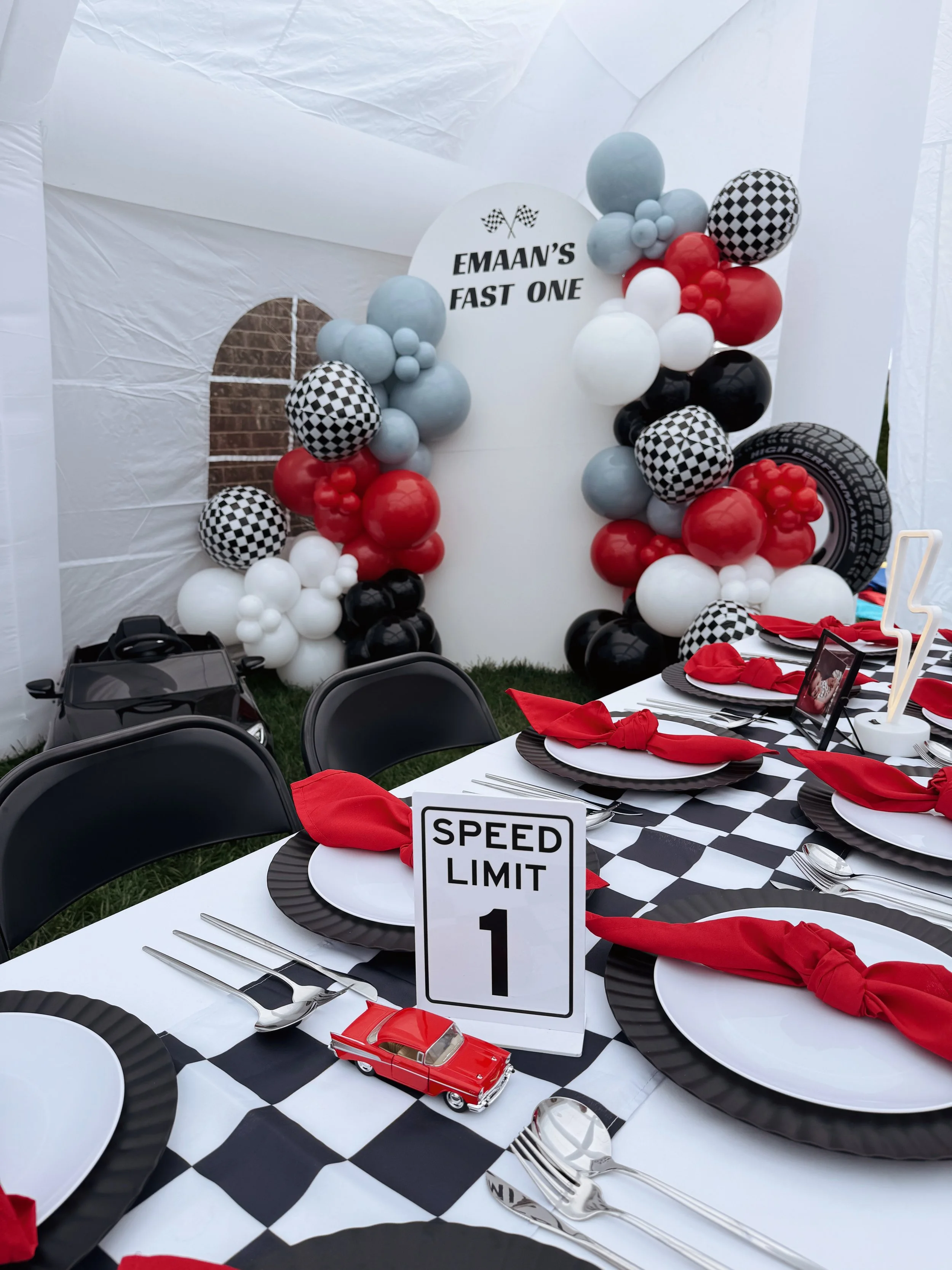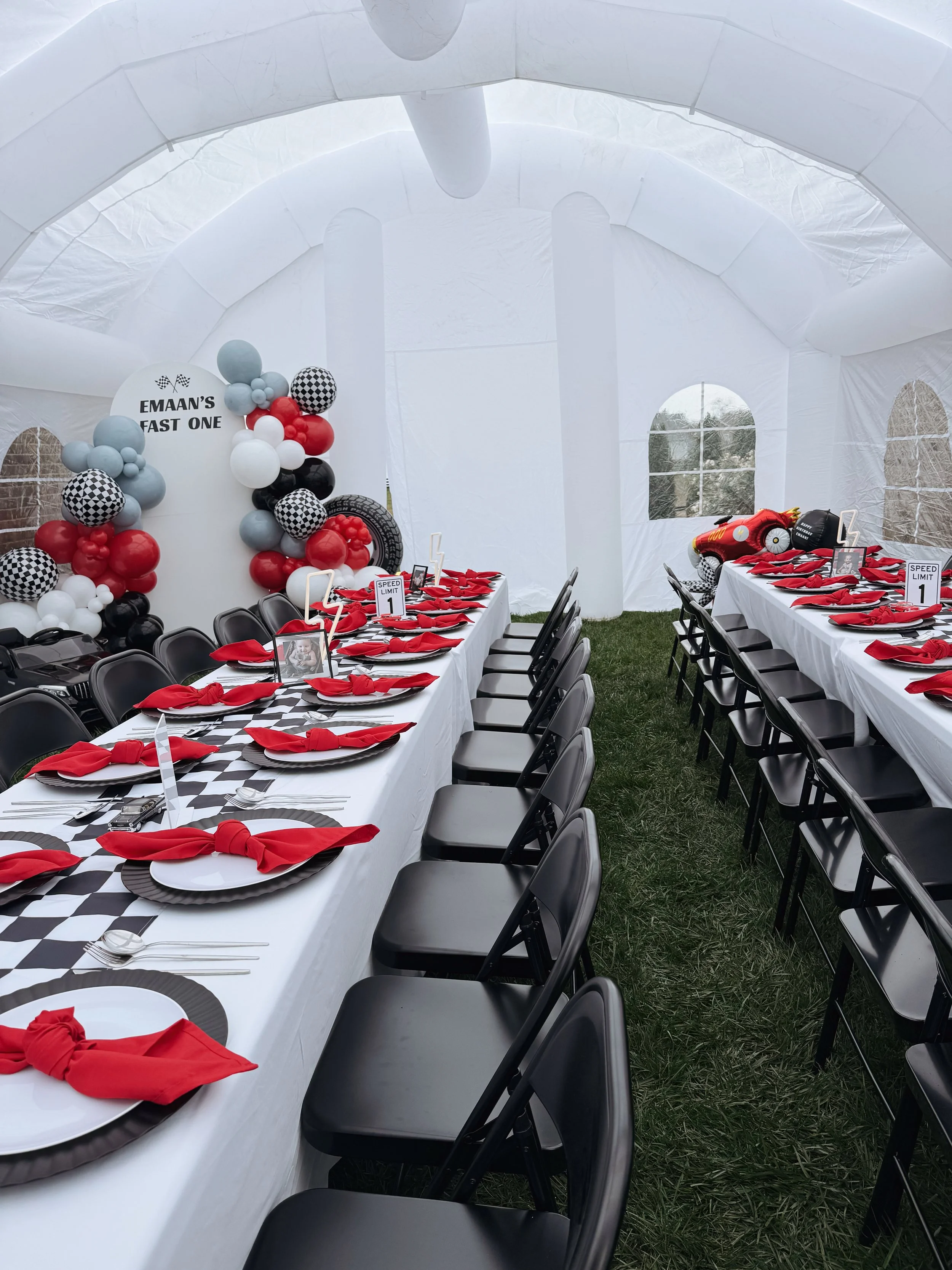 The Party of the Year Package is perfect for weddings and large celebrations with 100 guests or more. This package includes setup and pickup (please note: pickup does not include full breakdown), tablecloths, ten centerpieces, napkin rentals, charger plate rentals, two standard backdrops, deluxe balloon garland, and a welcome sign with easel rental.