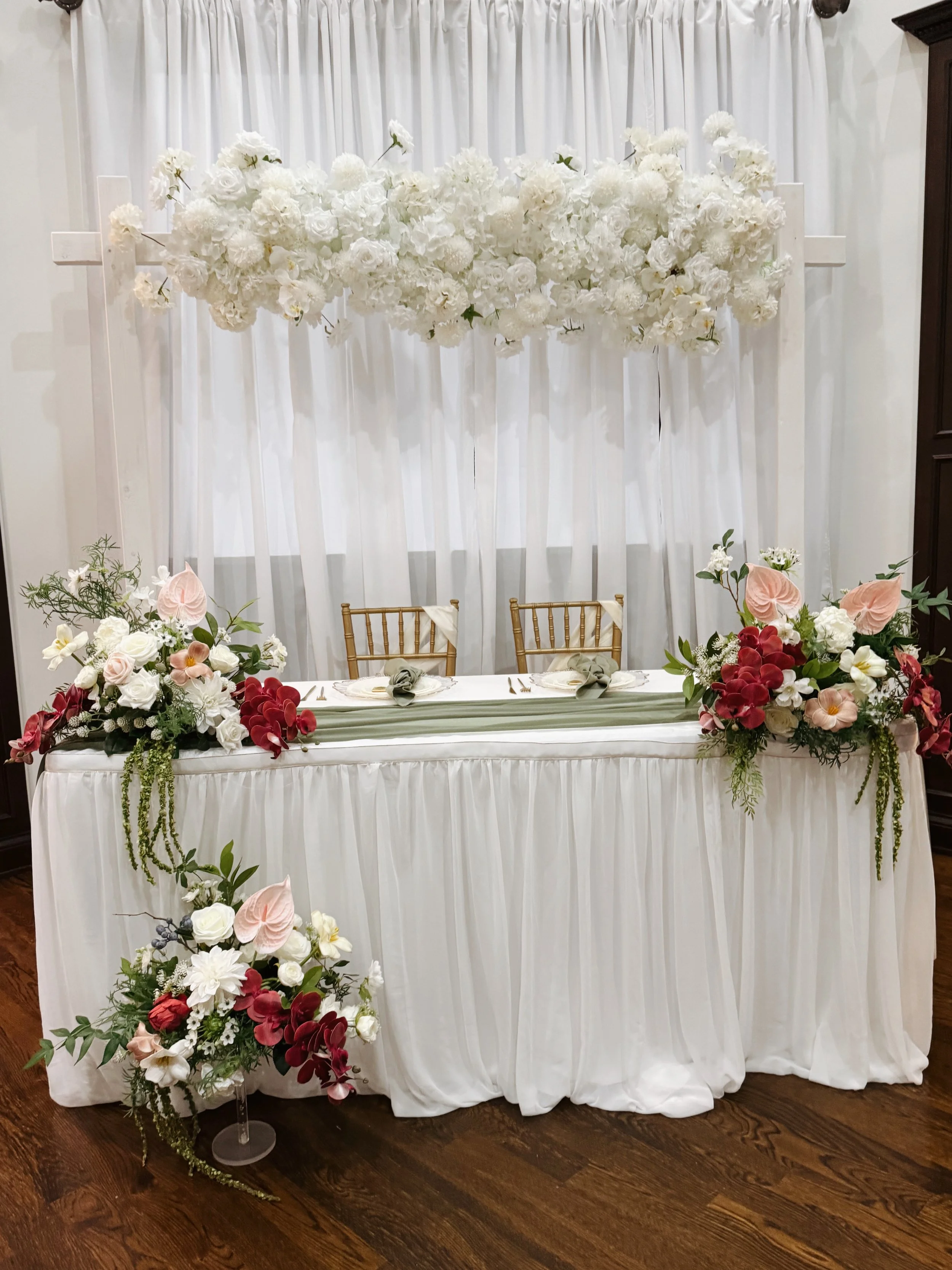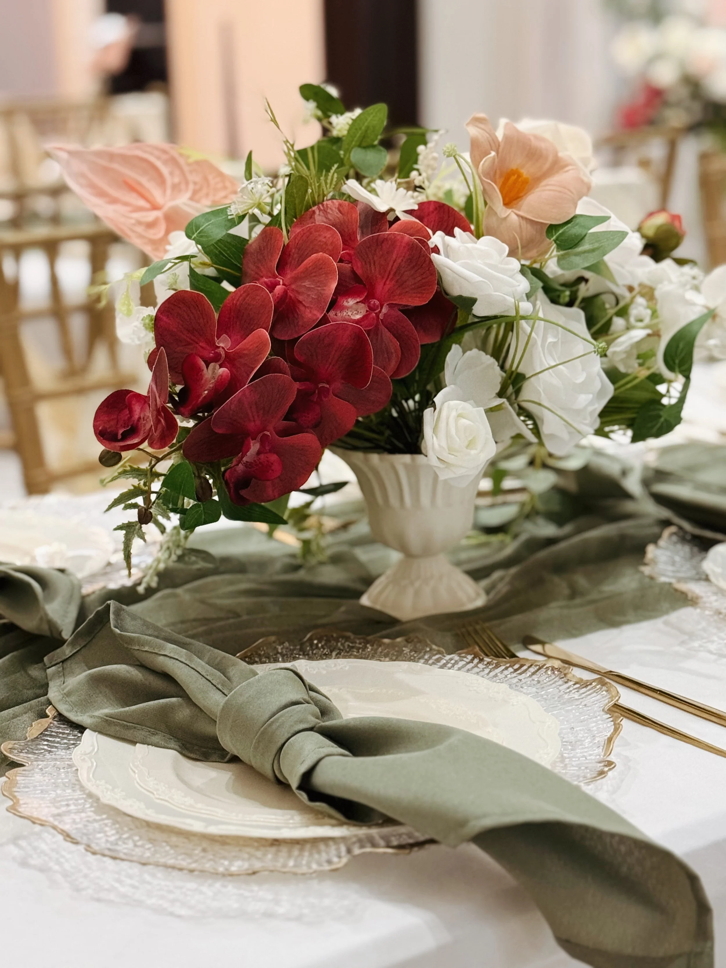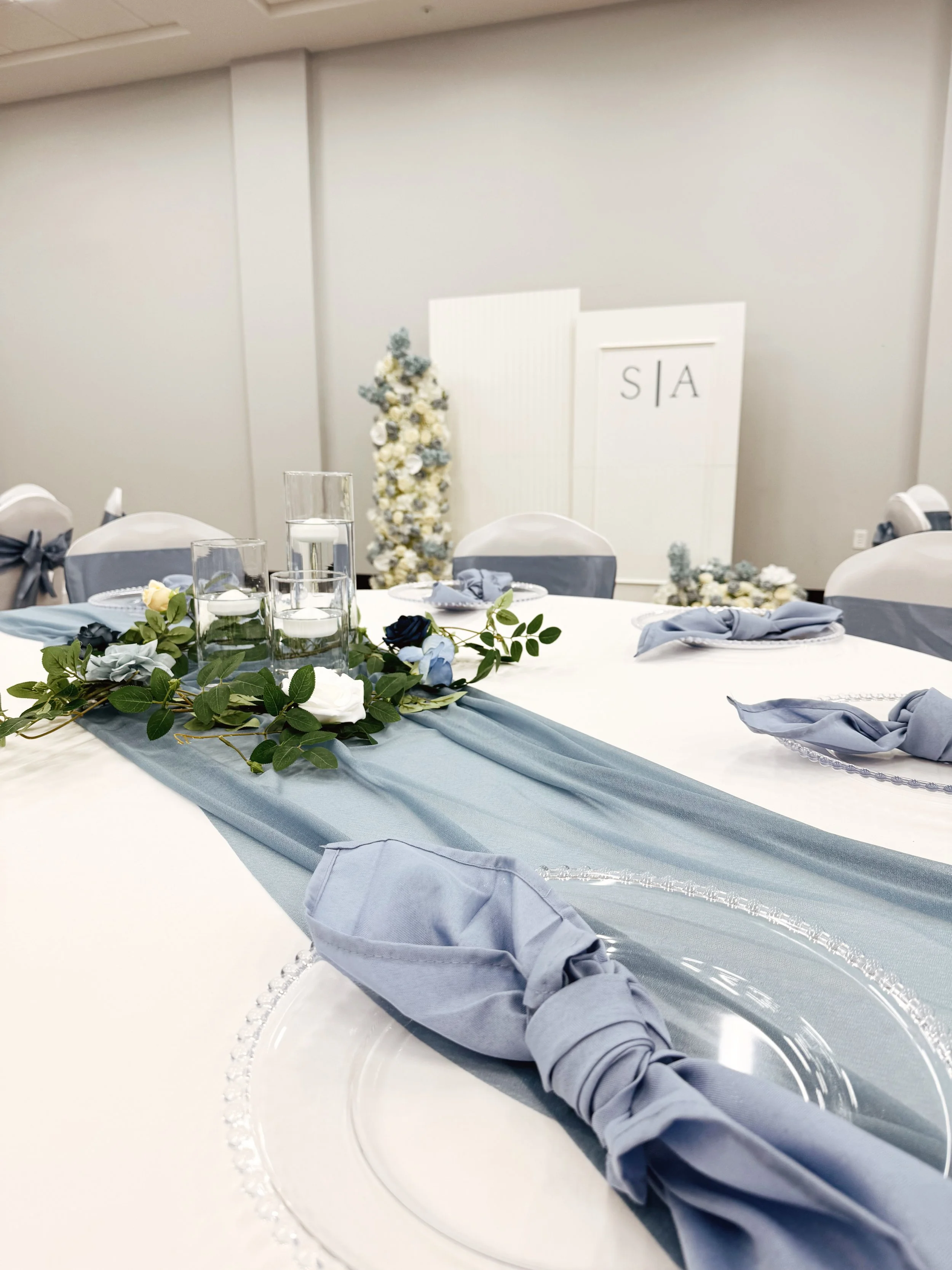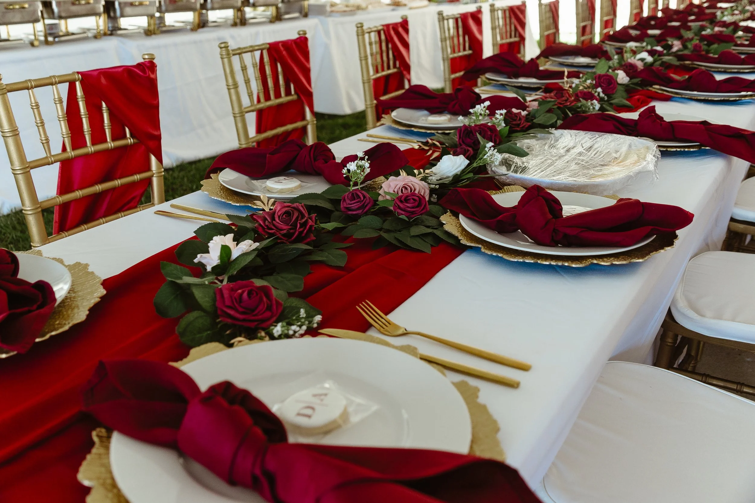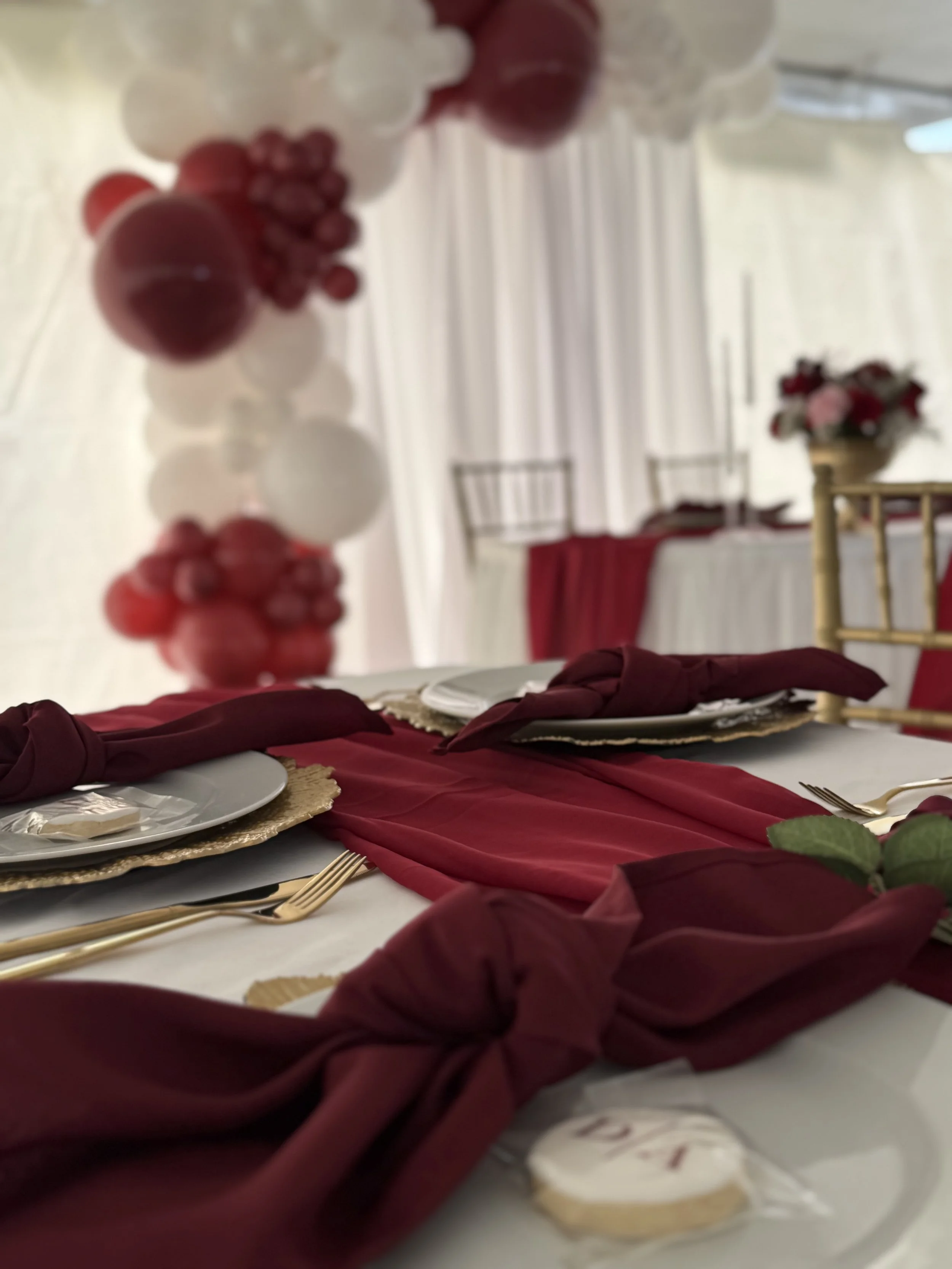Our most popular offering, is perfect for larger gatherings and weddings with 50 guests or more. This package includes setup and pickup (please note: pickup does not include full breakdown), tablecloths, five centerpieces, napkin rentals, charger plate rentals, two standard backdrops with 8-foot basic balloon garland or floral backdrop, and a welcome sign with easel rental.