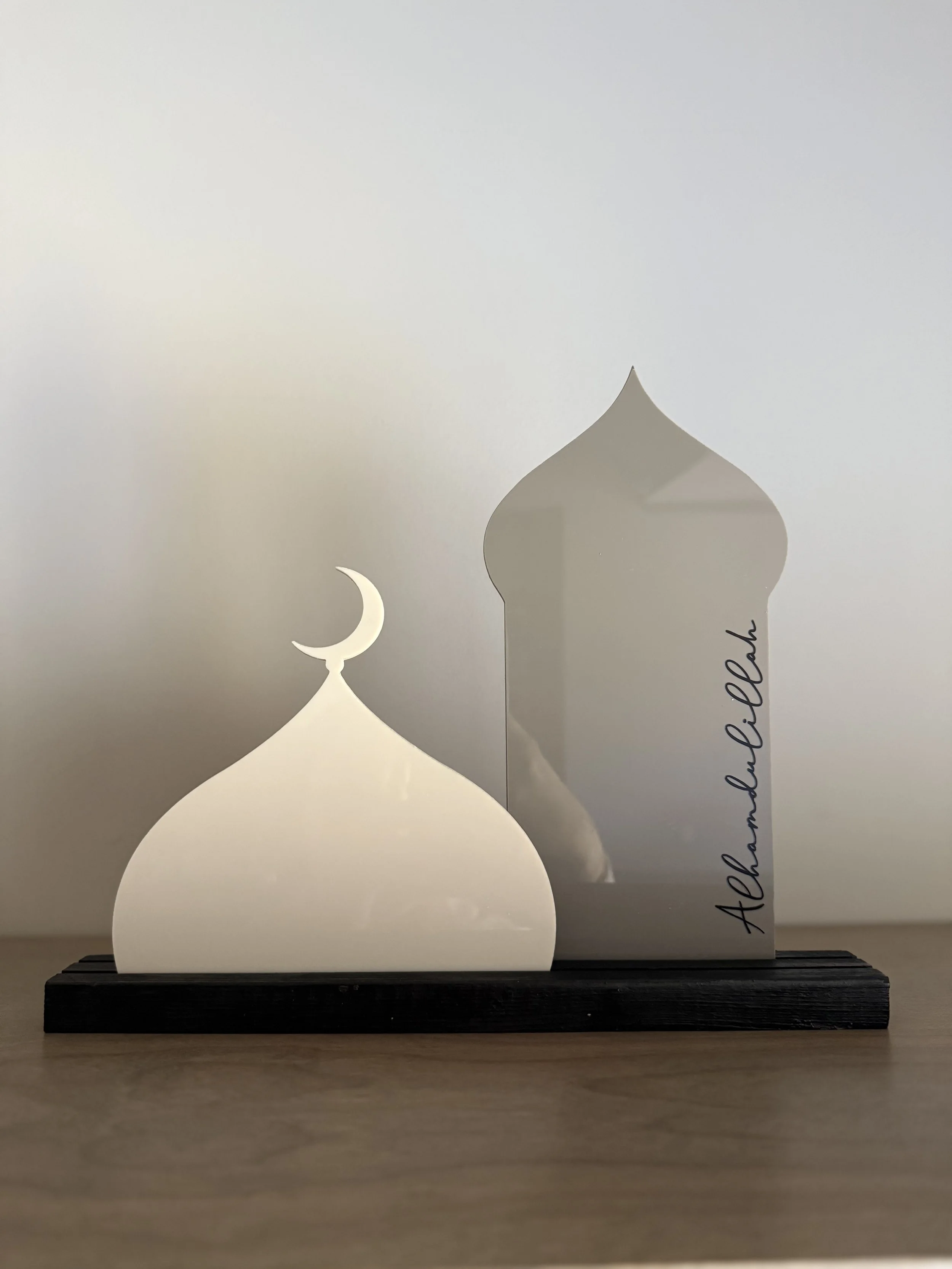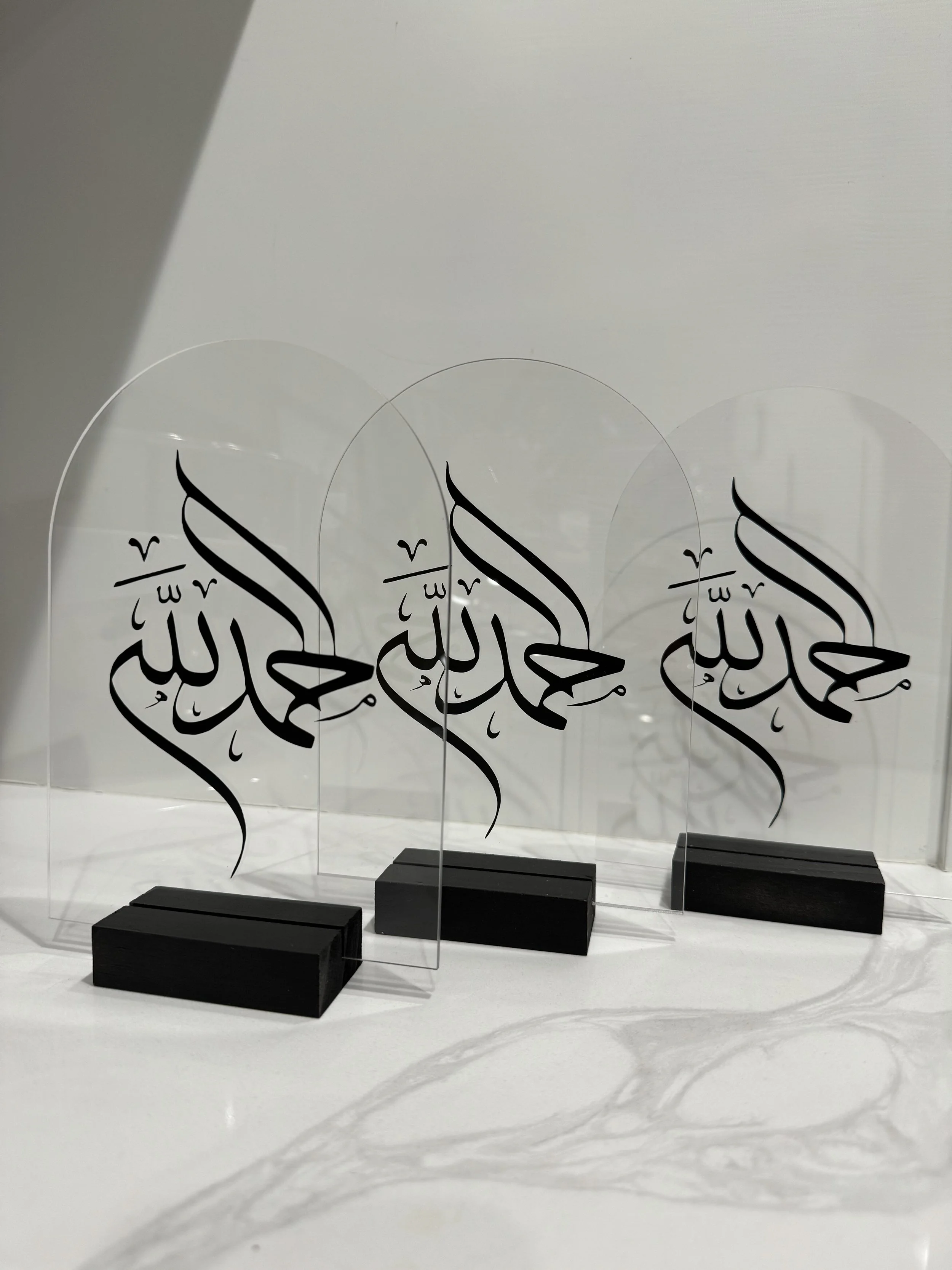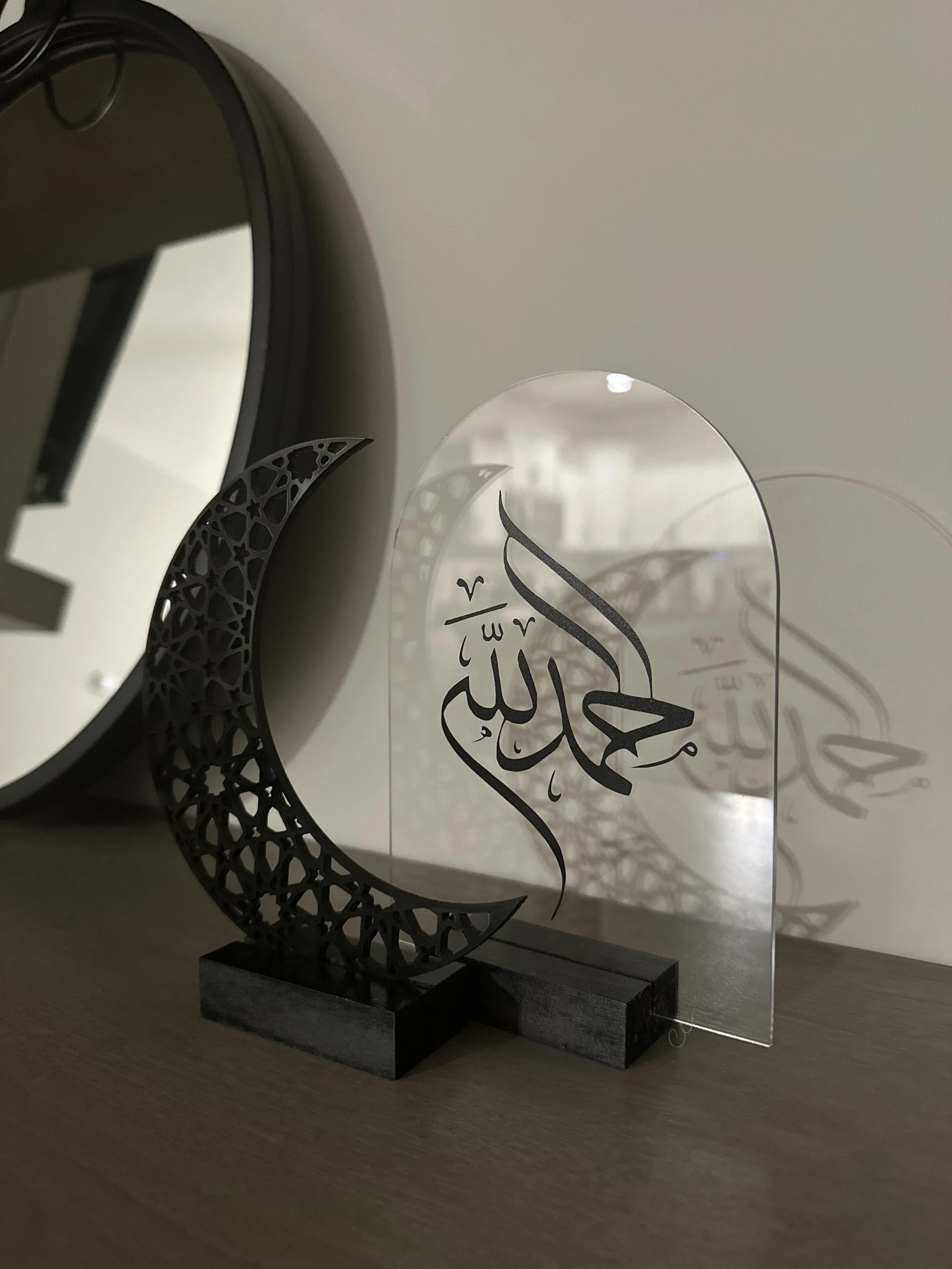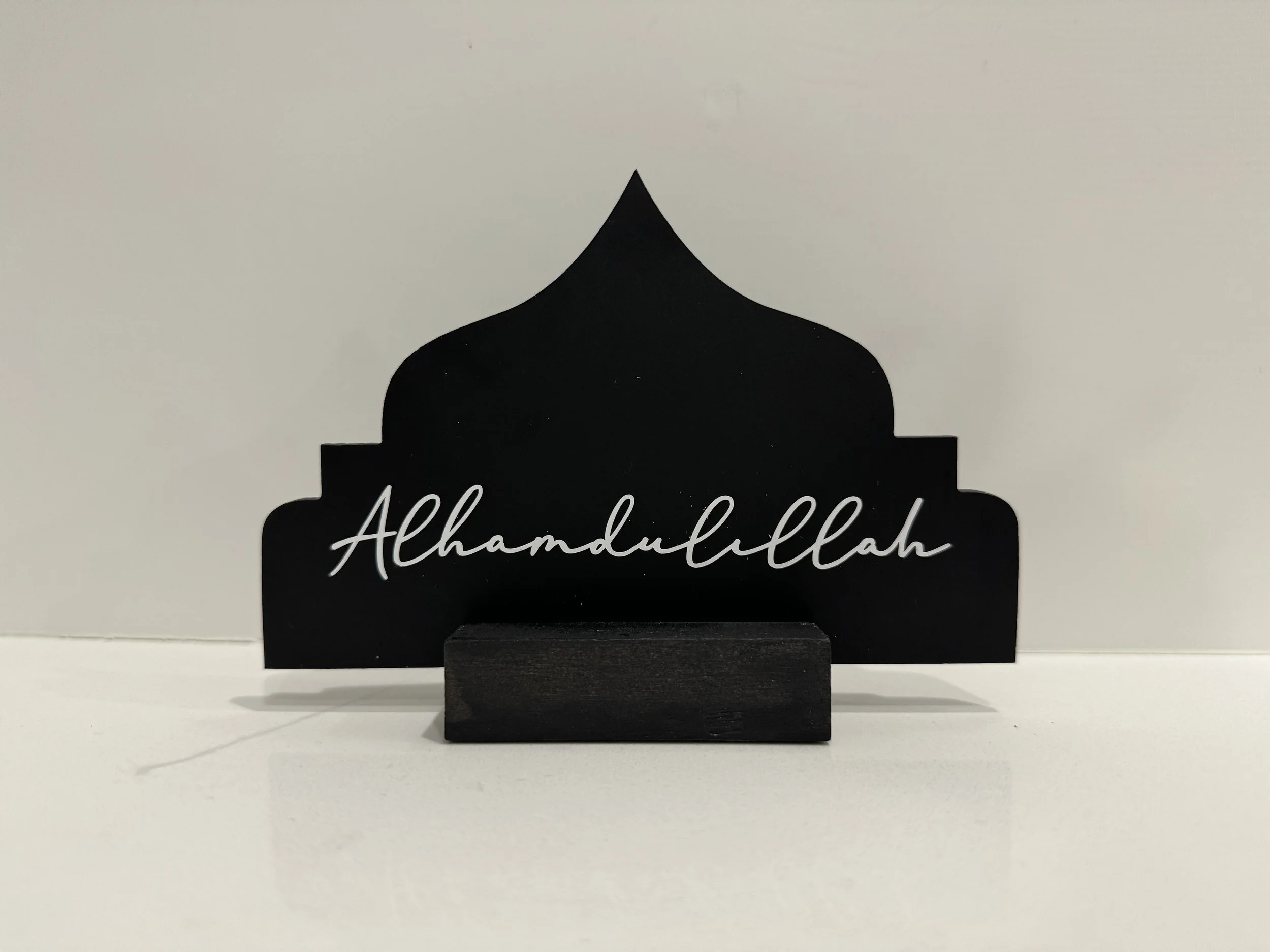 Geometric Crescent Moon from $22.00 Crescent Dome from $22.00 Bismillah Place Setting from $2.50 Alhamdulillah Dome Set $45.00 Crescent Moon Tags $0.75 Moon Picks $0.75 Napkin Rings from $2.00 Bless this Home Arabic Calligraphy $65.00 Alhamdulillah Script $65.00 Dome Mosque Silhouette Decor $12.00 Minaret Mosque Silhouette Decor $12.00 Mini Alhamdulillah $12.00 Quran stand $50.00 Alhamdulillah Arabic Calligraphy $15.00